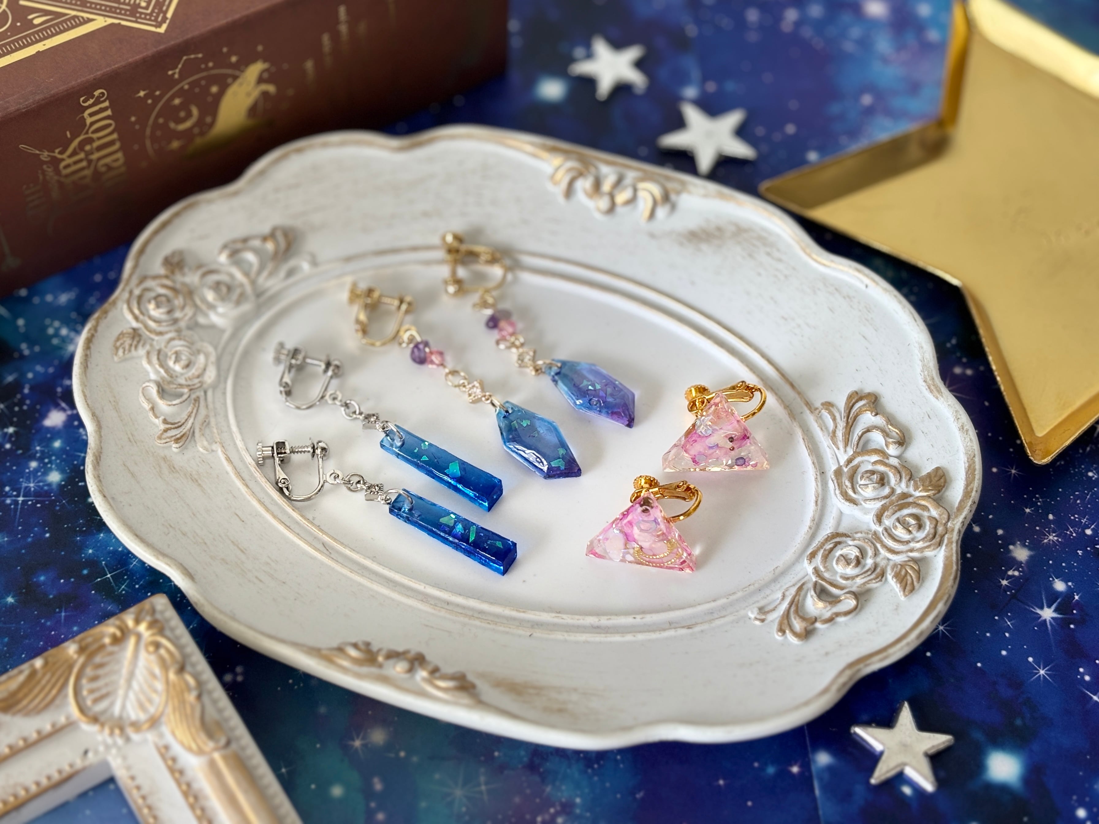 ・宇宙の鉱石をイメージしたイヤリング(全長約6cm)